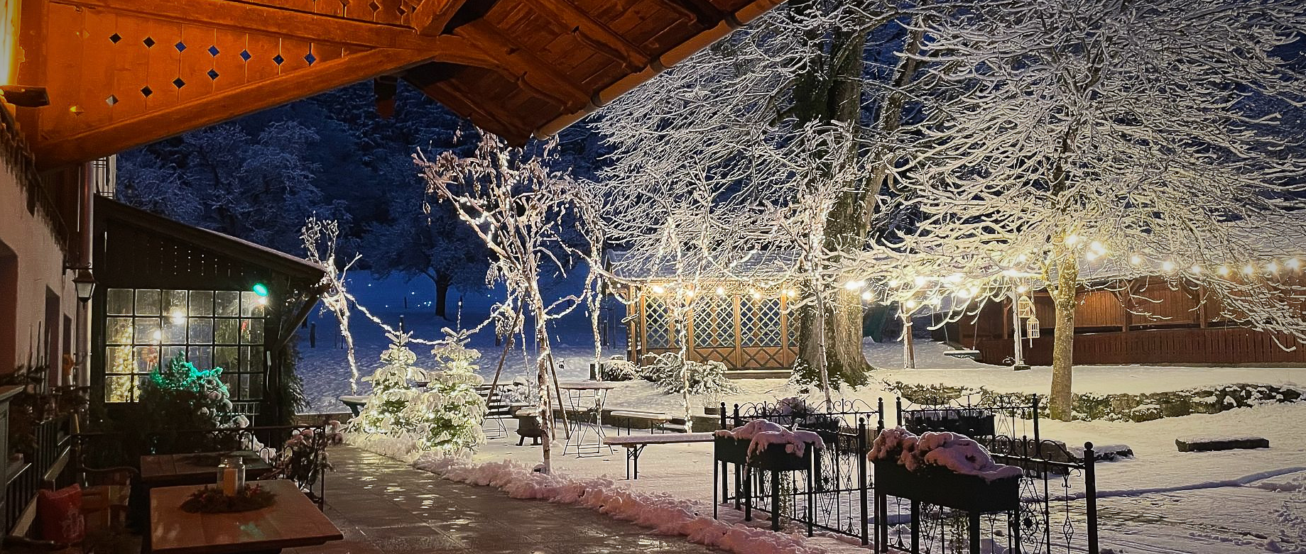 Bei schönem Wetter laden unser Biergarten mit 100 Sitzplätzen und der restaurierte Pavillon dazu ein, unter freiem Himmel zu feiern. Lassen Sie sich von der naturbelassenen Umgebung verzaubern und genießen Sie die Sonne in entspannter Atmosphäre.